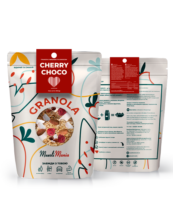 المكونات: جرانولا كلاسيكية (دقيق الشوفان، عسل النحل الطبيعي، زيت عباد الشمس المكرر، قرفة مطحونة، ملح)، فول سوداني مُغطى بالشوكولاتة 9% (شوكولاتة الحليب 30% (سكر أبيض، زبدة كاكاو، مسحوق حليب كامل الدسم، كتلة كاكاو، مسحوق مصل اللبن، مستحلب (صويا ليسيثين)، فانيلين)، فول سوداني محمص كامل)، قالب الشوكولاتة (شوكولاتة داكنة 86% (سكر أبيض، زبدة كاكاو، مسحوق حليب منزوع الدسم، مستحلب ليسيثين، فانيليا)، كرات أرز (جريش الأرز، جريش القمح، سكر أبيض، ملح، مثبت الصمغ العربي)، رقائق جوز الهند 6%، لوز، كرز متسامي 3%.