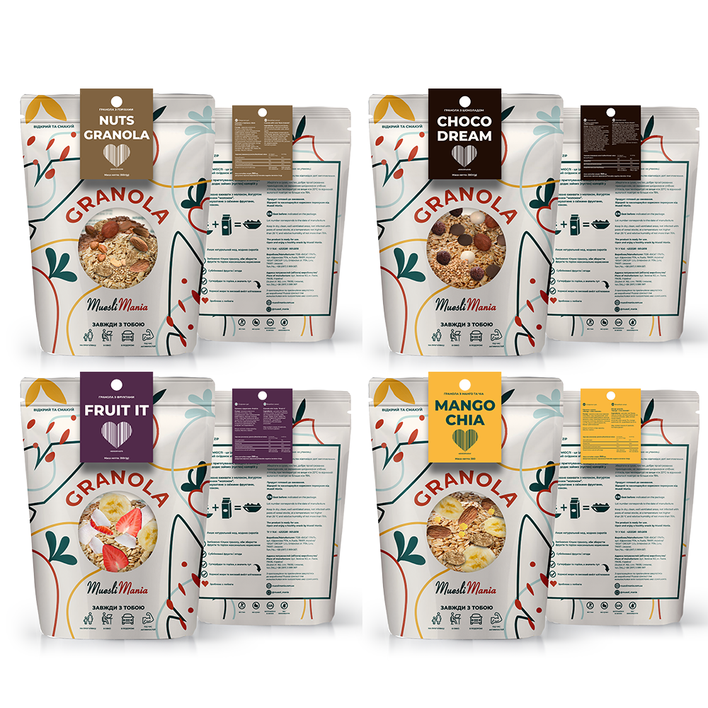 يتكون من ميوزلي، جرانولا وجرانولا مقرمشة، تشكيلة خط الإنتاج تتكون من 11 وحدة إدارة مخزون، معبأة في أكواب ذات الإستخدام الواحد بسعة 70 جرام، وفي أكياس بسحاب بسعة 90 جرام و 350 جرام و 500 جرام.