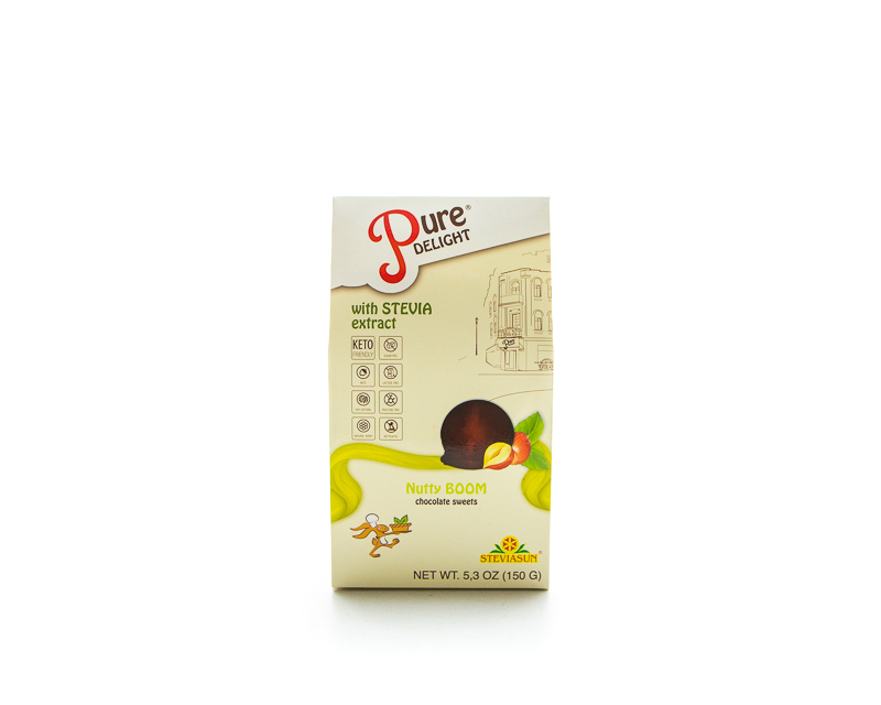 مزيج متناغم بين مكسرات البندق المفروم والفول السوداني والعسل مع خلاصة نبات الستيڤيا في الشوكولاته الداكنة "STEVIASUN"