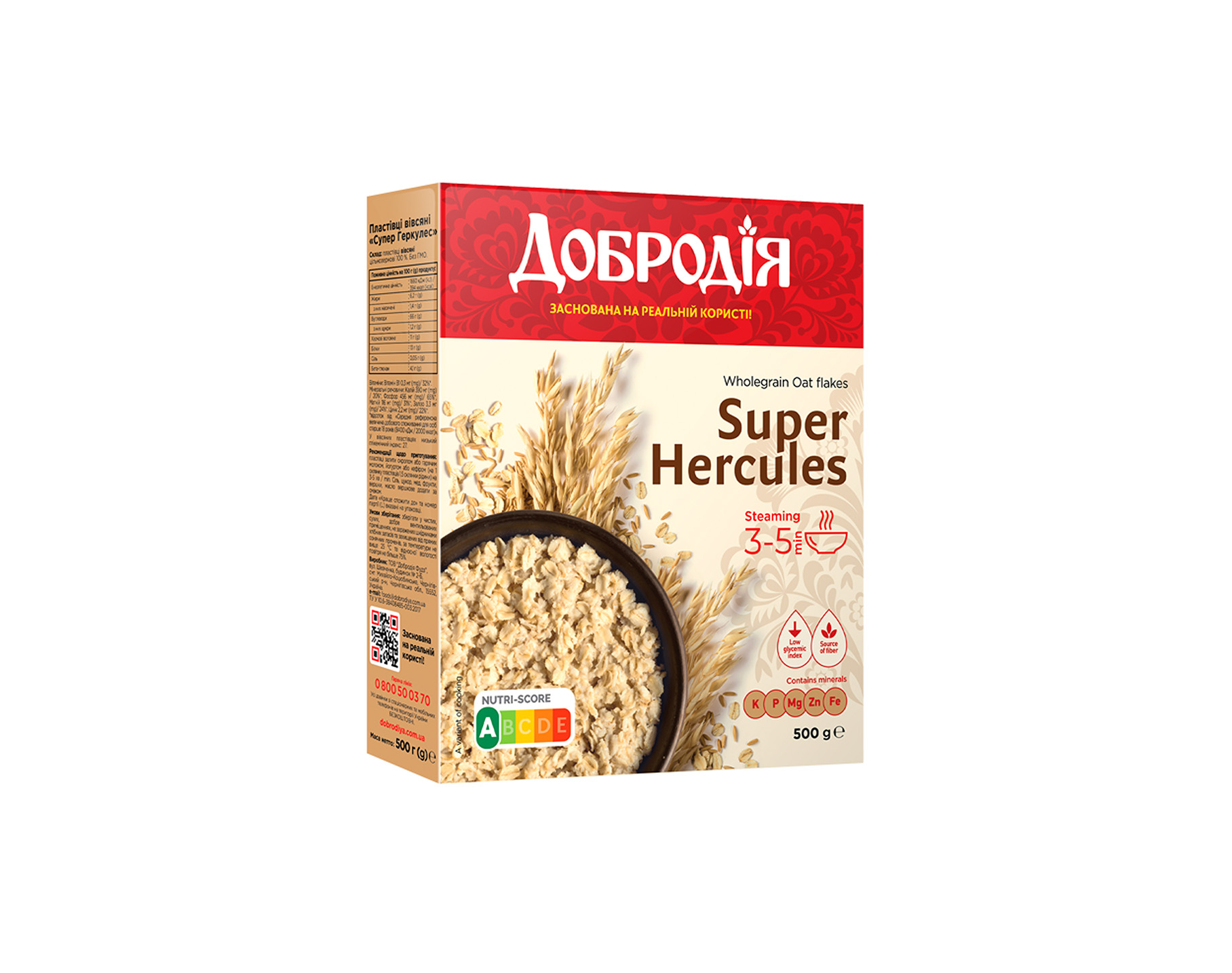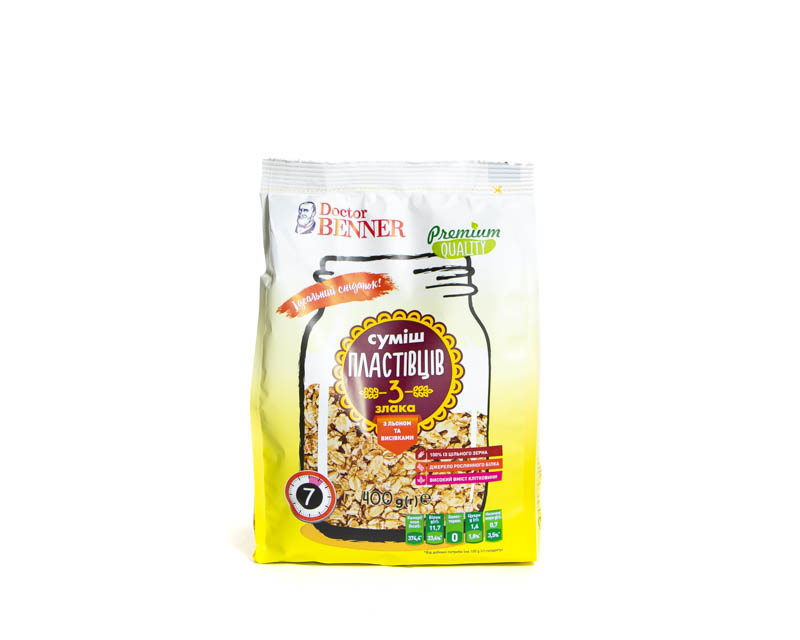المكونات: خليط من 3 حبوب 96.5% (رقائق القمح، الشوفان، الشعير)، بذور الكتان 2.5%، نخالة الشوفان 1.0%.