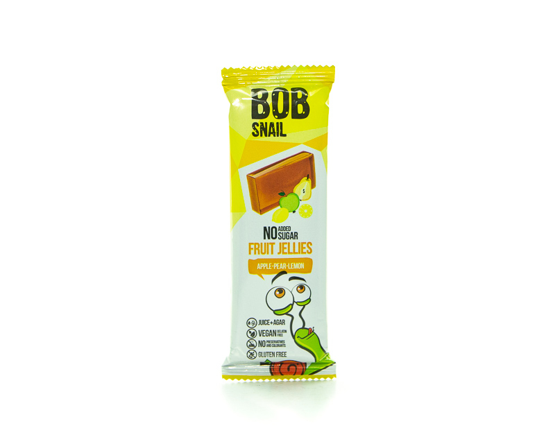 حلوى الفاكهة الطبيعية ذات العلامة التجارية "Bob Snail"، والتي يتم إنتاجها فقط من الفاكهة الطبيعية بدون إضافة سكر والأصباغ والمواد الحافظة بكافة أشكالها. هذا المُنتج يحتوي على التفاح والكمثرى فقط.