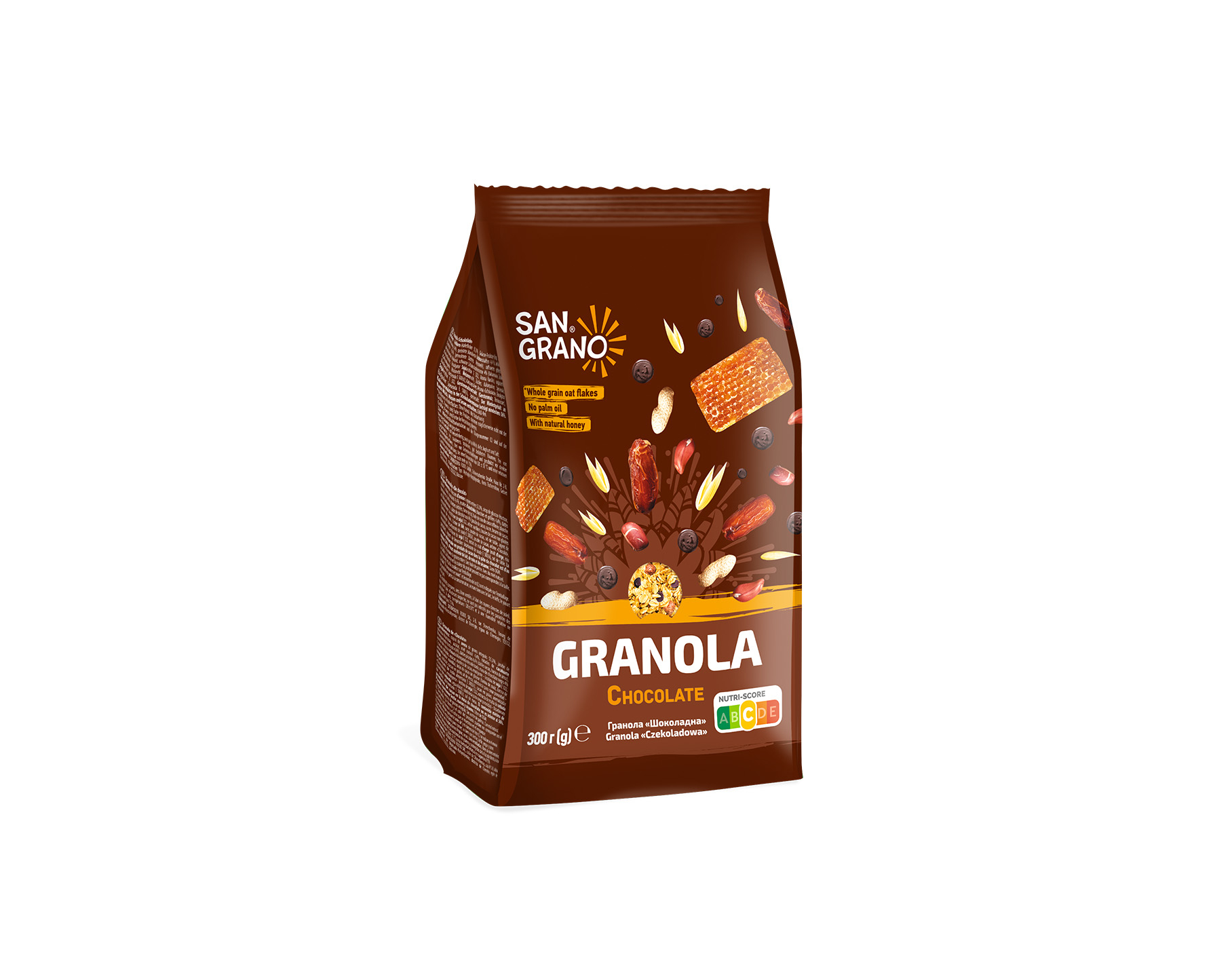 المكونات : رقائق الشوفان, شوكولا (22,0) ( مقدار من الكاكاو, زبدة الكاكاو, مستحلب الليسيثين) عسل, خليط من المكسرات بنسب متغيرة (لوز محمص وكاجو) بودرة الكاكاو.