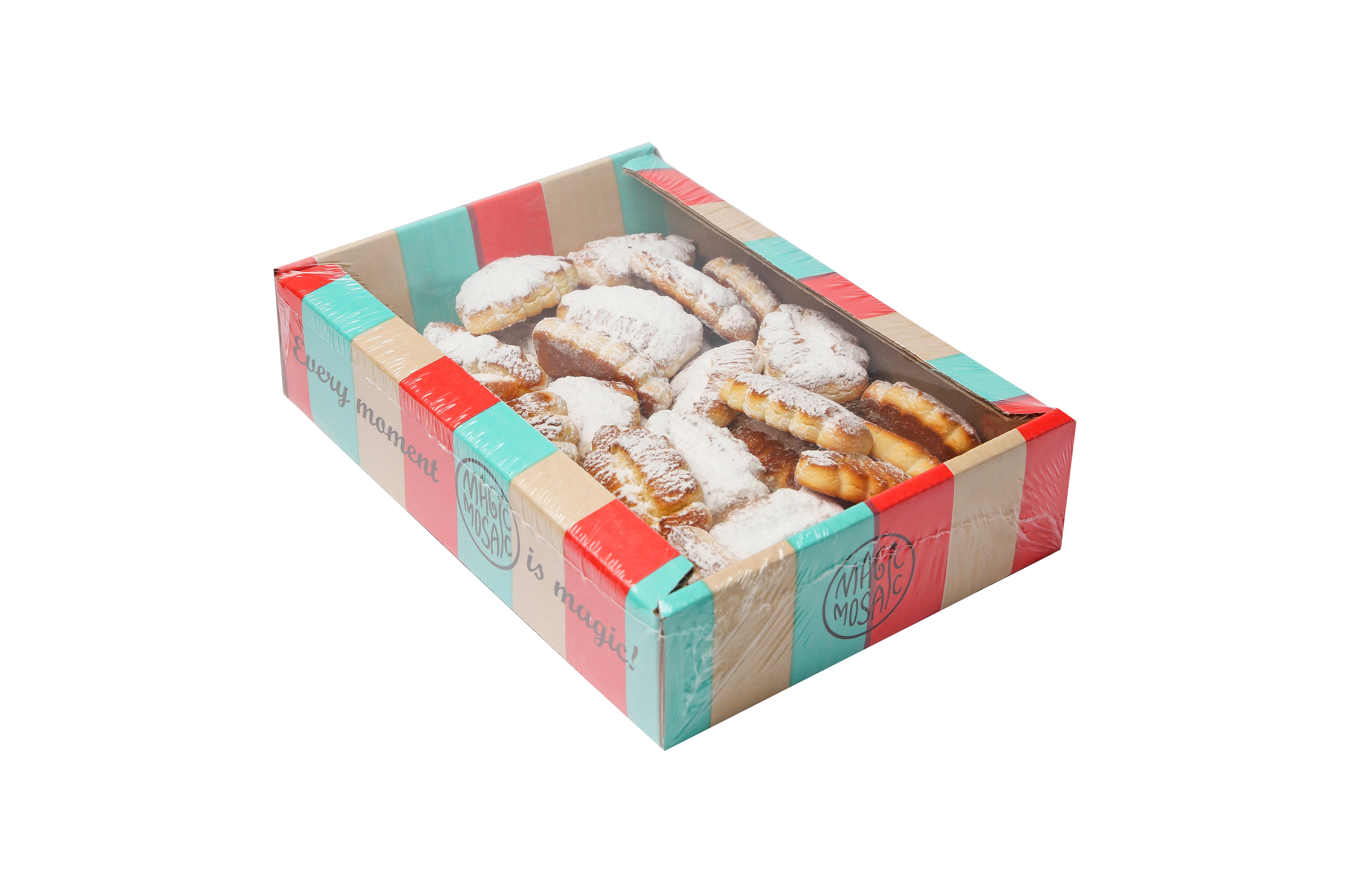كعك هش ذو رائحة جذابة، تم إستخدام منتجات األلبان الطبيعية في عملية اإلنتاج، على شكل أوراق األشجار. تم رش الكعك بسخاء بمسحوق السكر الناعم والفانيليا. يذكرنا طعم المنتج بكعك الجدة البيتي. الوزن في الصندوق 3 كيلوجرام، 1 كيلوجرام، 4.0 كيلوجرام. البيع بالوزن وبالقطعة )300 جرام(.