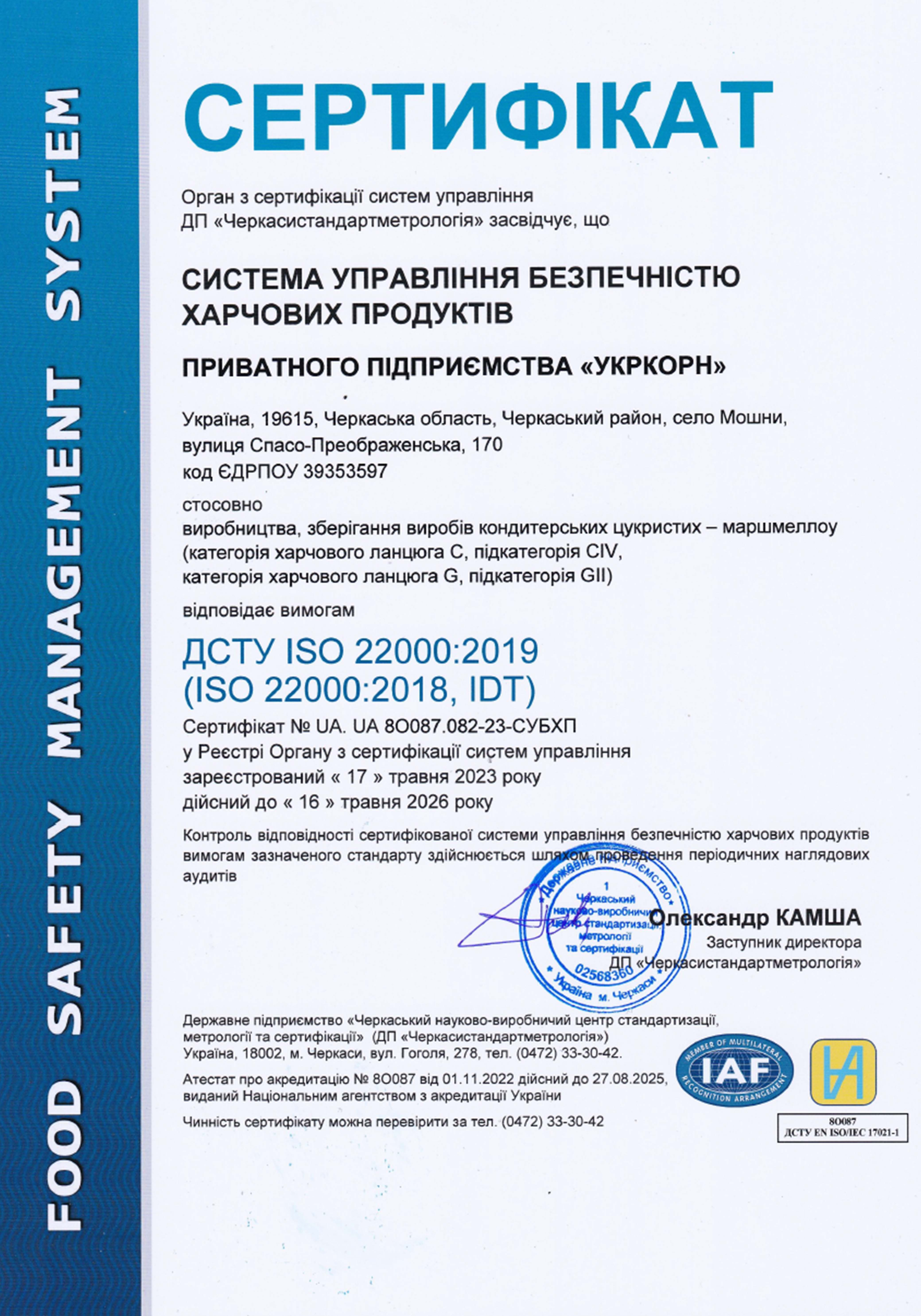 PE „Ukrkorn“ ist ein ukrainisches Produktionsunternehmen, das sich auf die Herstellung von Marshmallows unter der Marke „Tucha“ spezialisiert hat.