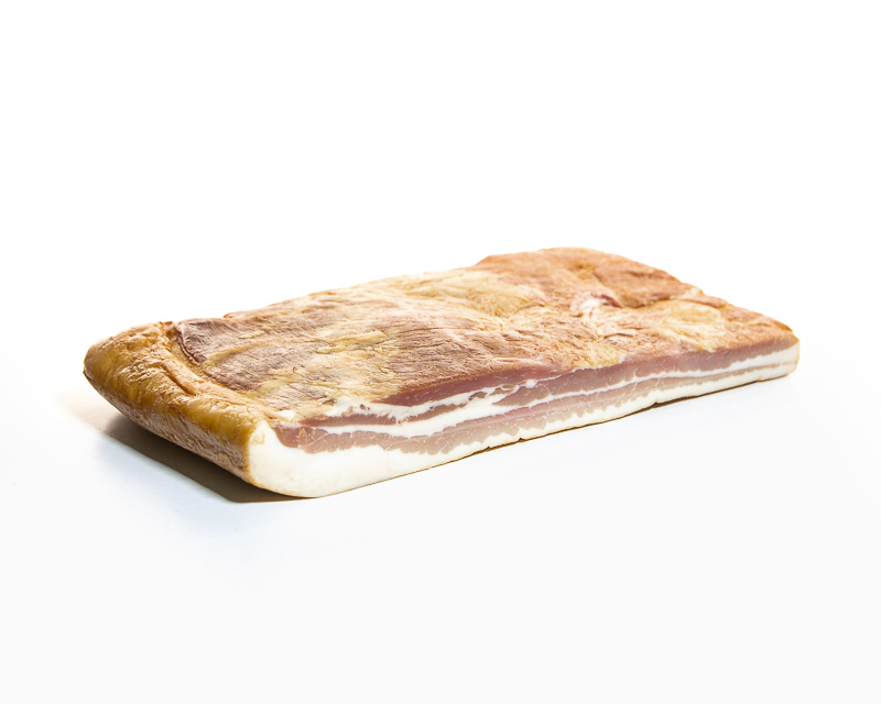 Gekochter und geräucherter Speck ist ein klassischer Schweinespeck mit vielseitiger gastronomischer Verwendung. Zutaten: Schweinefleisch (Brustbein / Sternum), Meersalz, Zucker, Dextrose, Konservierungsmittel E-250, Aroma "Bacon".