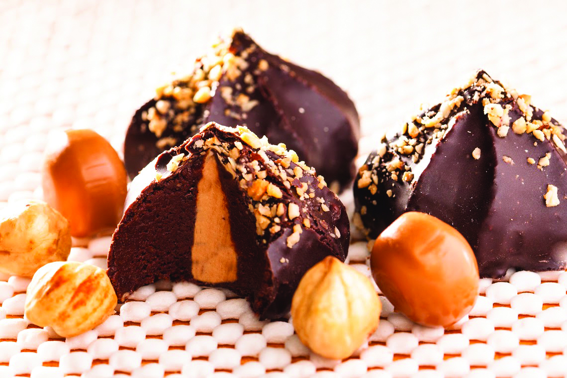 Ein Produkt wie ein Schokoladendessert, basierend auf Sandkrümeln, vollständig mit dunkler Glasur bedeckt und mit gehackten Erdnüssen bestreut. Es hat eine sehr raffinierte Form und eine zarte Karamellfüllung im Inneren. Gewicht im Karton 2 kg; 0,8 kg