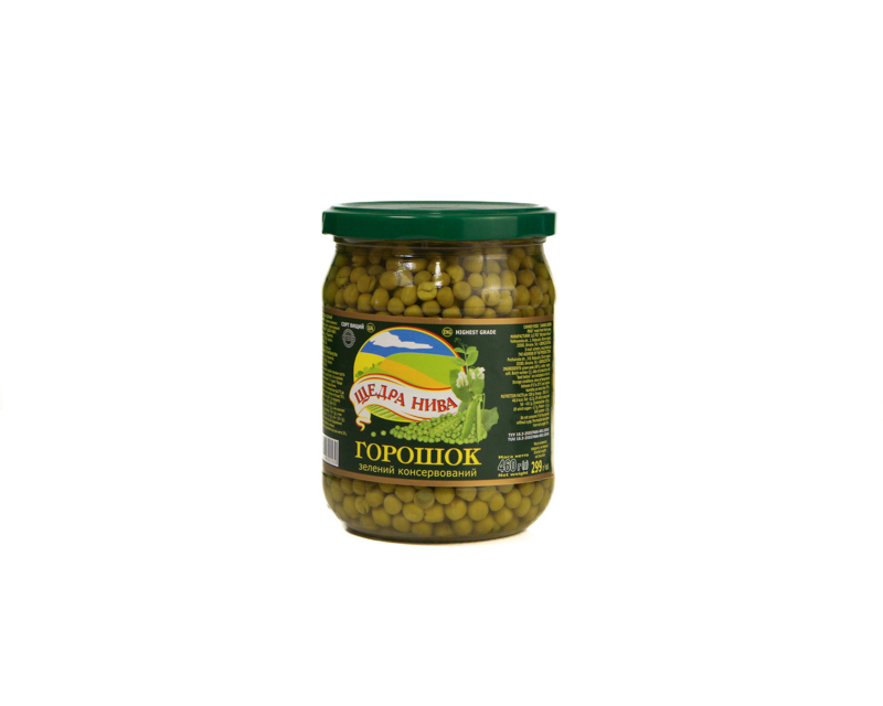 Canned green peas 299/460 g. Fresh peas of tender varieties (65%), water, white sugar, salt. Storage conditions: Store between 0°C to 25°C, with relative humidity not exceeding 75%. Shelf life: 3 years 10 months.