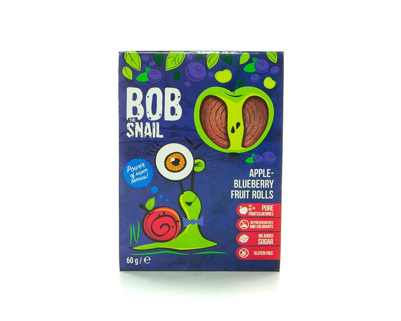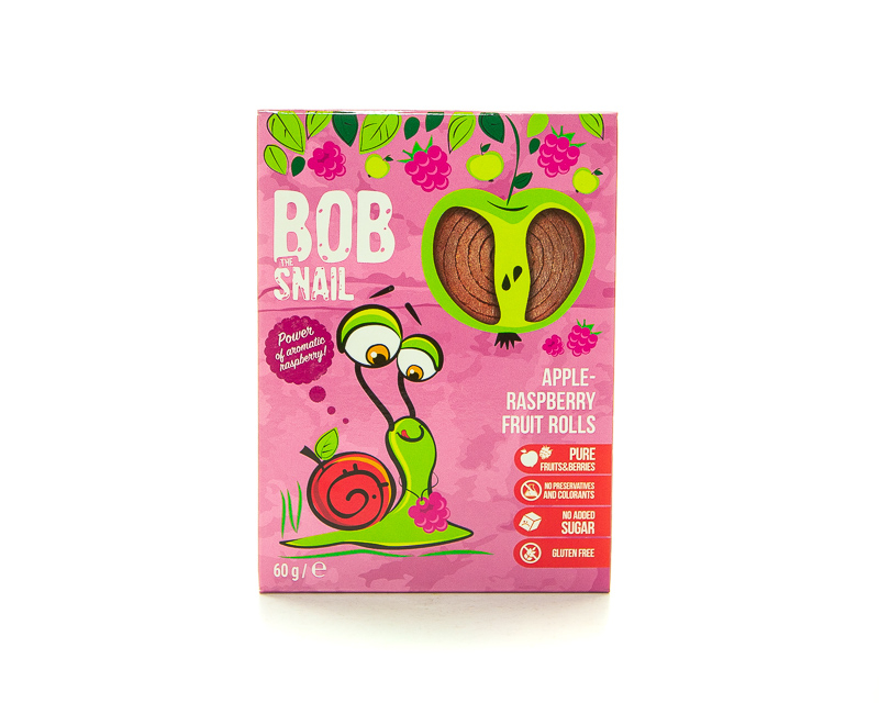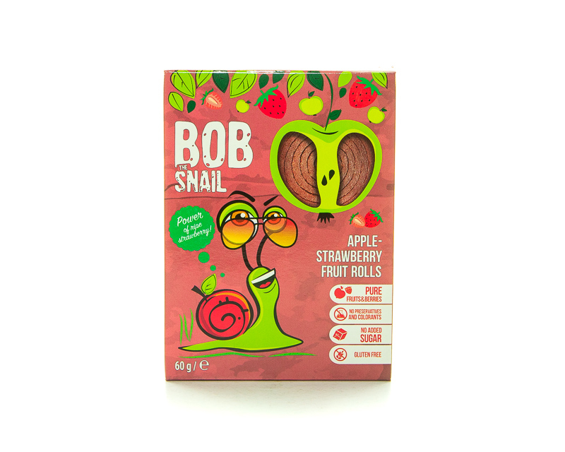 Hатуральні фруктові солодощі TM Bob Snail, котрі виготовлені лише з фруктів без додавання цукру, барвників та консервантів. У складі продукту лише яблуко та полуниця.