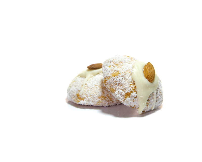 Mit Kokosflocken dekorierter Butterkeks mit Zusatz von weißer Schokolade und Mandeln. Zutaten: Weizenmehl der höchsten Güteklasse, Tafelmargarine, Zucker, Fettglasur, Kokosflocken, Mandeln, künstlicher Farbstoff E102.