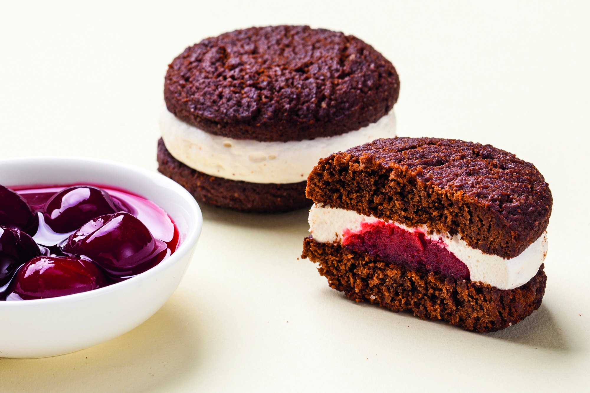 Zarter Sandwich-Keks mit doppelter Füllung - cremiges Soufflé und Kirschmarmelade. Kekse in Schokoladenfarbe haben eine rissige Oberfläche. Luftiges Soufflé auf Basis von Kondensmilch, schmeckt nach Eiscreme und Kirschmarmelade verleiht dem Produkt eine pikante Note. Eine unglaubliche Geschmackskombination. Zweiteilige Kekse in einer transparenten Verpackung. Gewicht im Karton 1,5 kg; 0,42 kg.
