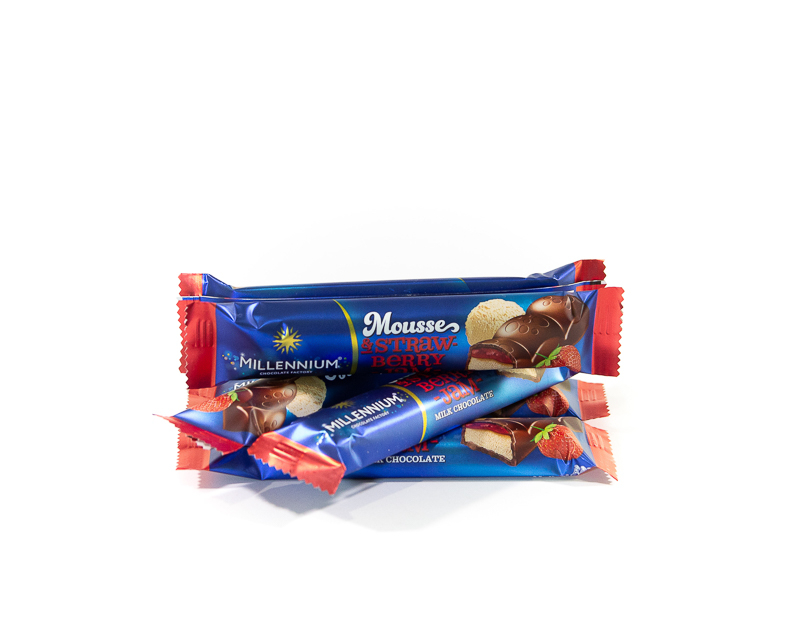 Milchschokolade, Sahnemousse und Erdbeermarmeladeim praktischen Riegelformat