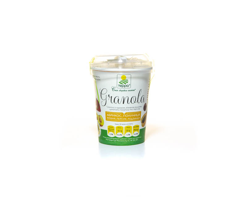 Zutaten: Backmischung (80,0%) (Haferflocken, Gerste, Roggen, Dinkel, Maisbällchen (Maisgrütze und -mehl, Zucker), natürlicher Honig, raffiniertes desodoriertes Sonnenblumenöl, Gerstenmalzextrakt, Himalaya-Salz, Vitamin E), Mischung aus getrockneten Früchten (13,5%) (in variablen Anteilen: Rosinen, getrocknete Kirschen, getrocknete Aprikosenstücke), eine Mischung aus kandierten Früchten (5,5%) (in variablen Anteilen: Erdbeerstücke, Pfirsichstücke, Glukose-Fruktose-Sirup), Stücke Kirschen und Erdbeeren gefriergetrocknet.