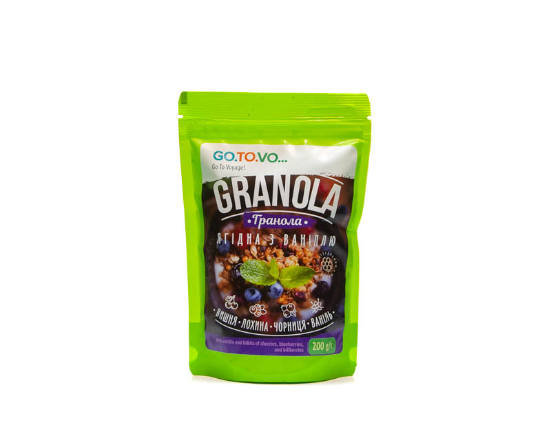 Granola enthält gebackene Vollkornflocken, natürliche Beeren, Früchte, Schokolade.