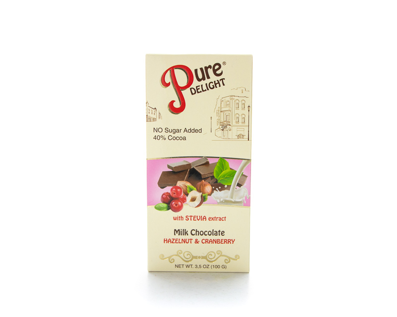 巧克力仅含天然可可制品,牛奶和乳脂成分。 成分:代糖(果糖,“ STEVIASAN”甜菊苷粉剂),可可块,可可脂,植脂奶油,熟榛仁碎块,蔓越莓干,全脂奶粉,大豆卵磷脂,香草
