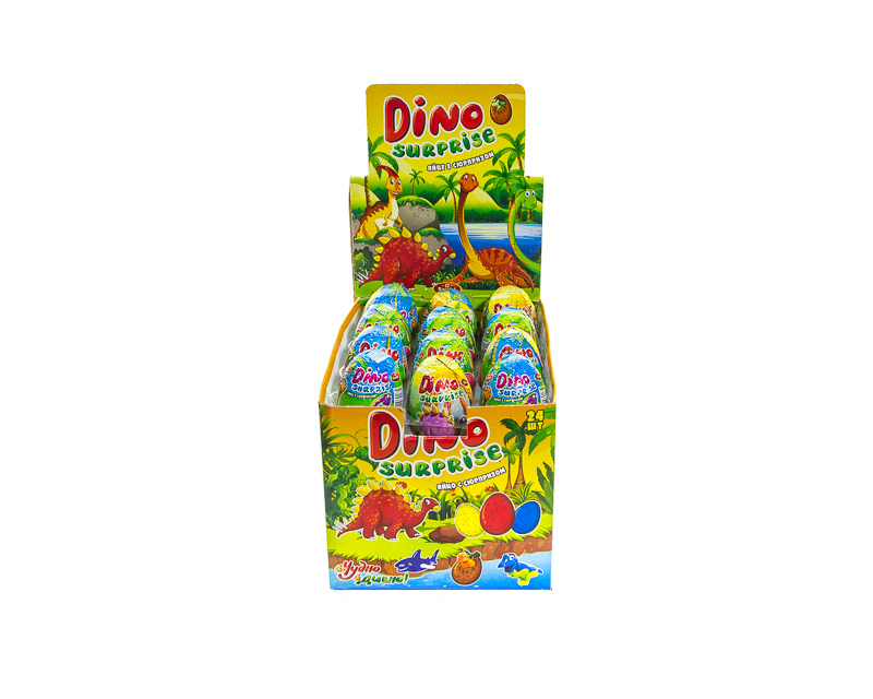 迪诺惊喜蛋是乌克兰制造的一种恐龙蛋主题包装玩具糖果。蛋中藏有适合各年龄组男女儿童的多种主题玩具。玩具具有E71安全证书。采用经认证进口设备,优质食材制作。