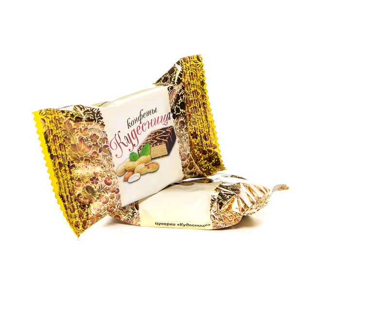 巧克力牛乳馅的细致和脆华夫饼加上果仁糖,挂糖衣的糖。
