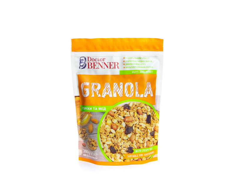 成分:烘焙混合物 96%(全麦燕麦片 53.7%、糖、棕榈油精、米粒(米粉、小麦粉、糖、食盐、发酵粉:碳酸氢钠)、玉米片(玉米糁、糖、大麦-麦芽提取物、食盐)、花生 2.8%、核桃仁 1.44%、全脂奶粉、天然蜂蜜 1.2%、芝麻、亚麻籽、杏仁片 0.72%、调味“核桃”、香兰素结晶)、填料 4%(蔓越莓干 4%)。