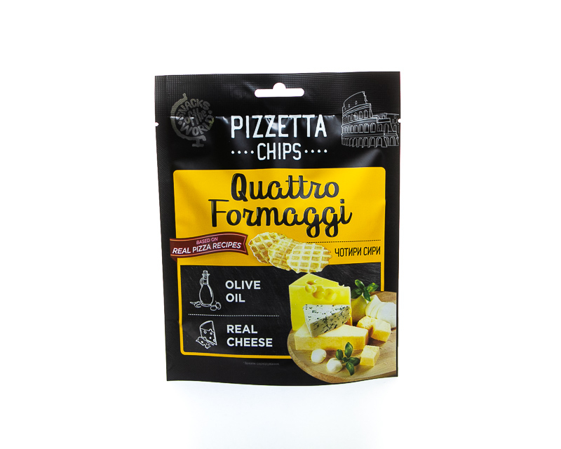 PIZZETTA CHIPS «QUATTRO FORMAGGI» 以其出色的口味范围而在其他产品中脱颖而出,因为只有该食谱包含以下奶酪:Maasdam («LEERDAMER»)、«Mozzarella»、«Parmigiano»、«GORGONZOLA»,当然还有牛至。